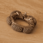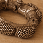 The bracelet is ornamented with bunched hollow balls ( gajre) rigidly fixed to the main body by threading a wire through their attached integral loops. This work is called moti ke gajre kam: the effect of bunching is called guchchedar. A silver ball bunched is called chandi ke gajre ka guchchha. These bracelets are worn by Rajasthani women.