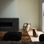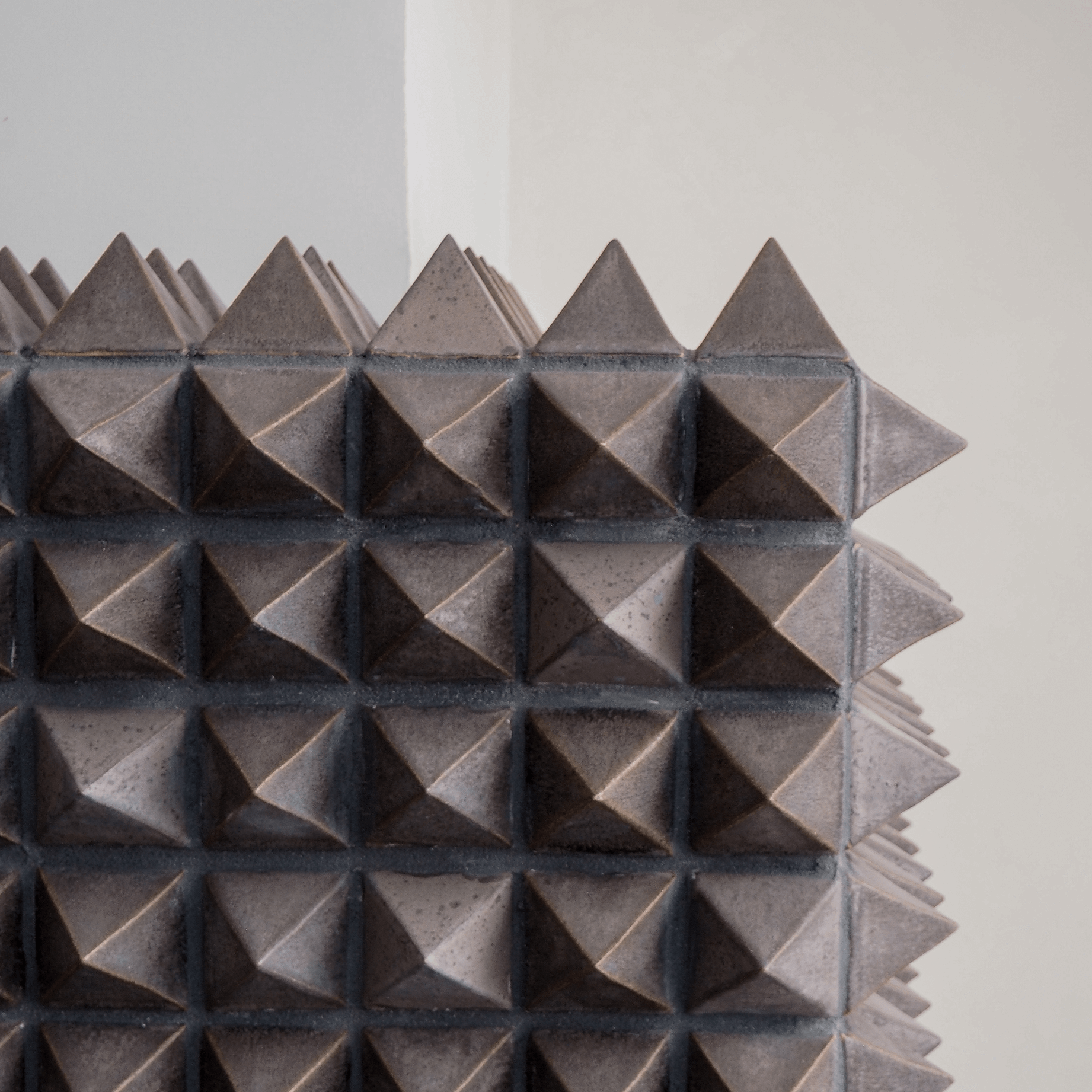 Designed by LGS Studios for the Thús Huma project, this fireplace acts as a dramatic architectural focal point. The surround is clad in custom ceramic tiles featuring a repeating grid of sharp, three-dimensional pyramids. This geometric, brutalist-inspired relief creates a dynamic interplay of light and shadow, adding intense depth and texture to the room. The dark, metallic-bronze finish of the ceramic gives the piece a moody, industrial edge that contrasts beautifully with the surrounding neutral walls and organic wood flooring.