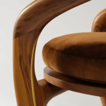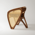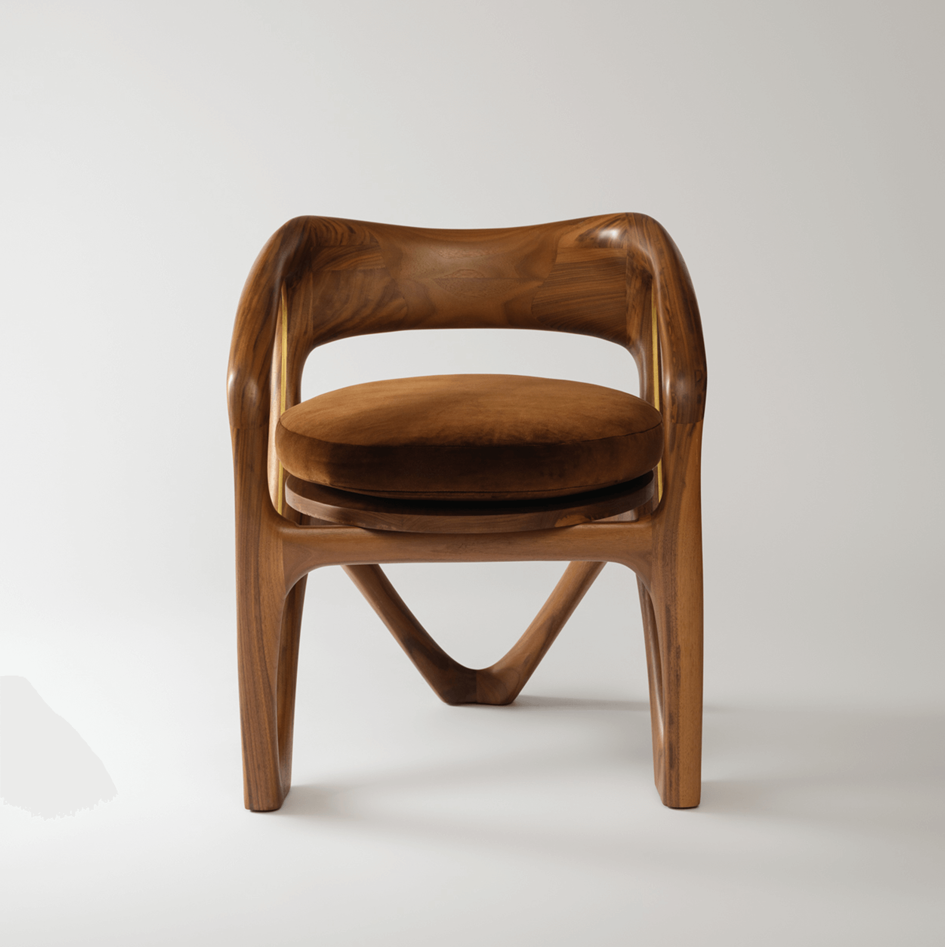 The Giza Chair A masterclass in organic geometry, the Giza Chair by Huma Sulaiman seamlessly merges the solidity of sculpted Walnut with the airy transparency of natural cane. Its striking silhouette—defined by fluid, continuous curves and a pyramid-inspired stance—is elevated by a slender brass spine that runs along the frame, creating a piece that balances architectural strength with artisanal elegance.
