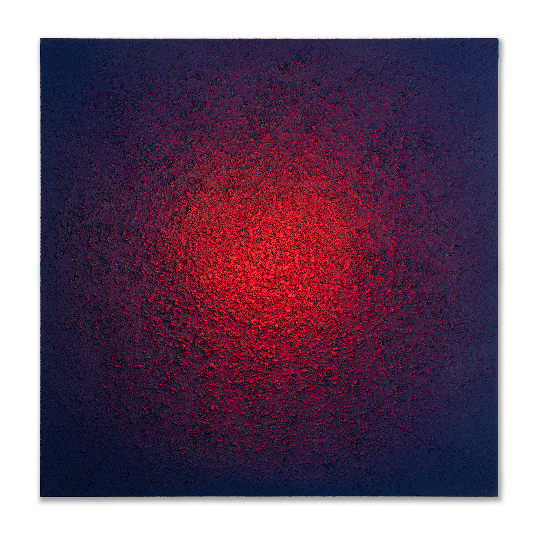 Navigating the vastness of the universe and the harmony found in the void. Dejong explores the birth of galaxies in these compositions. Against a backdrop of deep, infinite blue pigments, a central red mass pulsates with texture. The work acts as a snapshot of creation in the vacuum of space, balancing the chaos of scattered matter with the stillness of the void.