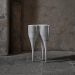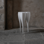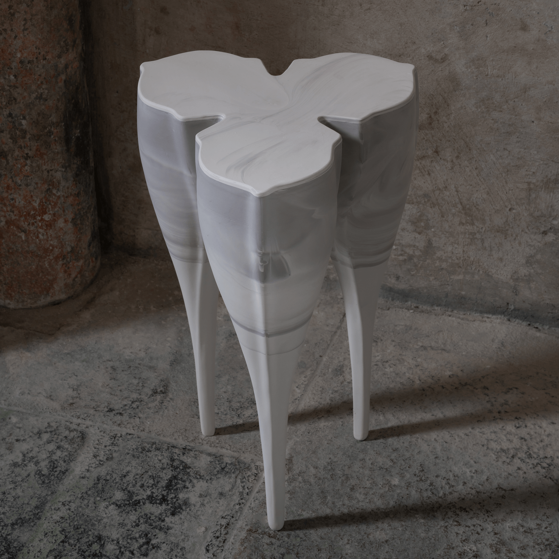 Nuria Coffee Table Created by French artist Nadège Mouyssinat, the Nuria table is a surrealist exploration of balance and organic form. Hand-sculpted in her Limoges studio, the piece features three tapered, root-like legs that merge seamlessly into a fluid, tri-lobed surface. The design draws inspiration from vegetal growth and "protective femininity," resulting in a silhouette that feels both ancient and futuristic. Its seamless, monolithic structure gives the impression of a living object paused in motion, embodying the artist's signature fusion of technical precision and sensual, biological curves.