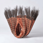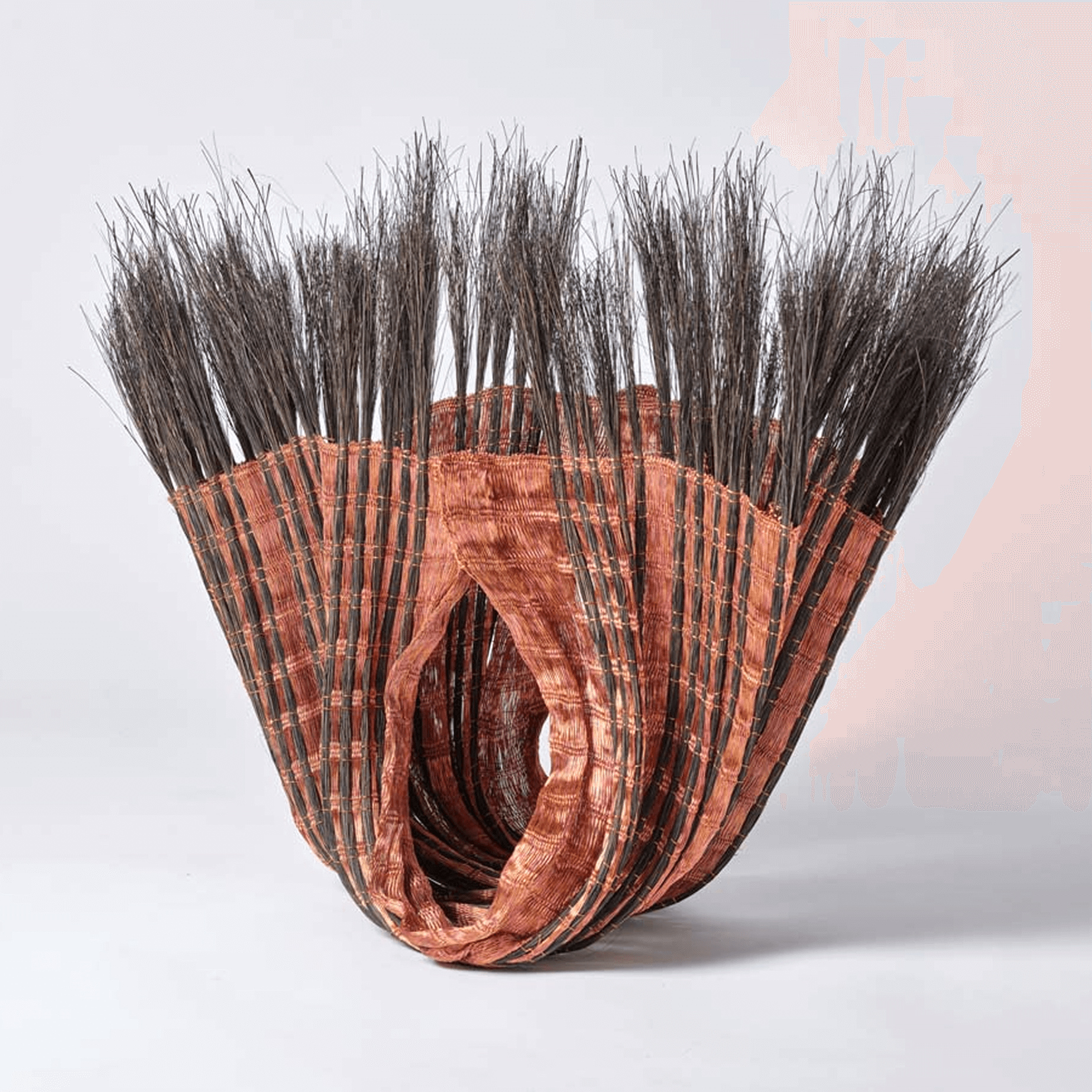 This sculptural vessel is a striking example of Beck's three-dimensional textile art. Resembling its marine namesake, the piece is constructed from a sophisticated interplay of lacquered copper wire and natural fibers. The form curves organically, rising into a crown of stiff, bristle-like filaments—likely horsehair or plant fibers—that create a dynamic, tactile silhouette. The warm, metallic tones of the copper contrast with the raw, natural textures, embodying Beck's signature fusion of industrial and organic elements.