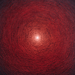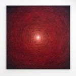 A profound study of gravitational pull, Dejong layers texturized red pigments that spiral inward, transitioning into a blinding white center. The piece serves as a visual metaphor for the point where space and time merge into infinite density, echoing the raw power of a black hole's core.